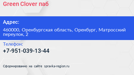 Green Clover, паб по адресу 460000, Оренбургская область, Оренбург, Матросский переулок, 2 в дальнейшем Организация, размещена в следующих категориях: