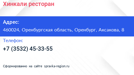Хинкали, ресторан по адресу 460024, Оренбургская область, Оренбург, Аксакова, 8 в дальнейшем Организация, размещена в следующих категориях: