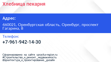 Хлебница, пекарня по адресу 460021, Оренбургская область, Оренбург, проспект Гагарина, 8 в дальнейшем Организация, размещена в следующих категориях: