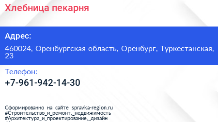Хлебница, пекарня по адресу 460024, Оренбургская область, Оренбург, Туркестанская, 23 в дальнейшем Организация, размещена в следующих категориях: