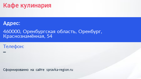 Кафе-кулинария по адресу 460000, Оренбургская область, Оренбург, Краснознамённая, 54 в дальнейшем Организация, размещена в следующих категориях: