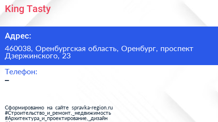 King Tasty по адресу 460038, Оренбургская область, Оренбург, проспект Дзержинского, 23 в дальнейшем Организация, размещена в следующих категориях: