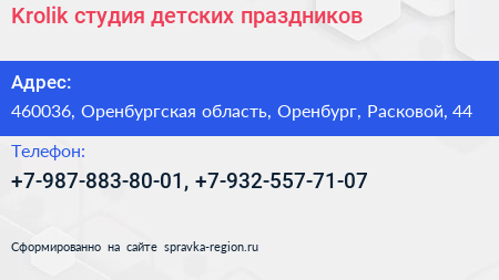 Krolik, студия детских праздников по адресу 460036, Оренбургская область, Оренбург, Расковой, 44 в дальнейшем Организация, размещена в следующих категориях: