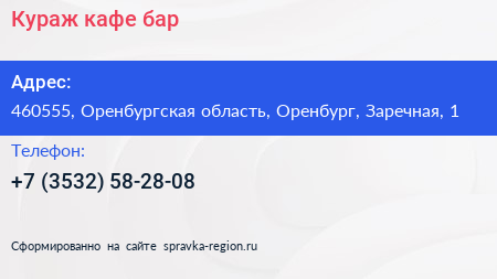 Кураж, кафе-бар по адресу 460555, Оренбургская область, Оренбург, Заречная, 1 в дальнейшем Организация, размещена в следующих категориях: