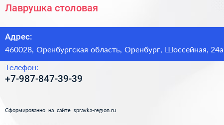 Лаврушка, столовая по адресу 460028, Оренбургская область, Оренбург, Шоссейная, 24а в дальнейшем Организация, размещена в следующих категориях: