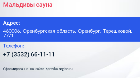 Мальдивы, сауна по адресу 460006, Оренбургская область, Оренбург, Терешковой, 77/1 в дальнейшем Организация, размещена в следующих категориях: