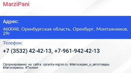 MarziPani по адресу 460048, Оренбургская область, Оренбург, Монтажников, 29г в дальнейшем Организация, размещена в следующих категориях: