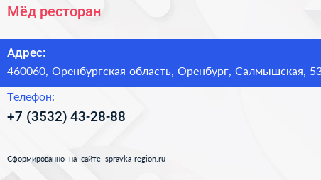 Мёд, ресторан по адресу 460060, Оренбургская область, Оренбург, Салмышская, 53 в дальнейшем Организация, размещена в следующих категориях: