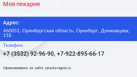 Моя пекарня по адресу 460051, Оренбургская область, Оренбург, Донковцева, 11Б в дальнейшем Организация, размещена в следующих категориях: