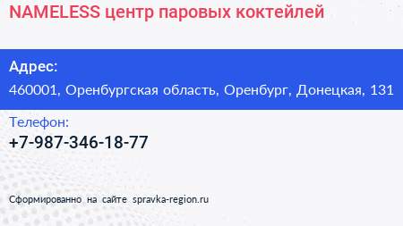 NAMELESS, центр паровых коктейлей по адресу 460001, Оренбургская область, Оренбург, Донецкая, 131 в дальнейшем Организация, размещена в следующих категориях: