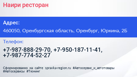Наири, ресторан по адресу 460050, Оренбургская область, Оренбург, Юркина, 2Б в дальнейшем Организация, размещена в следующих категориях: