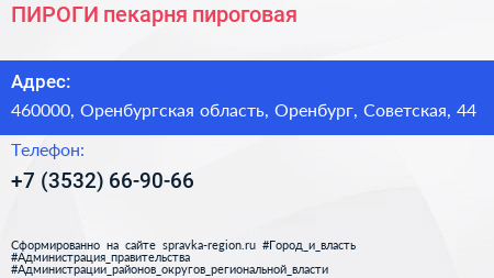 ПИРОГИ, пекарня-пироговая по адресу 460000, Оренбургская область, Оренбург, Советская, 44 в дальнейшем Организация, размещена в следующих категориях: