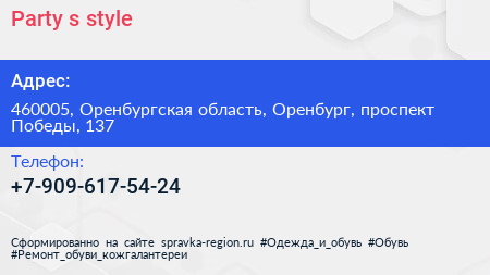 Party`s style по адресу 460005, Оренбургская область, Оренбург, проспект Победы, 137 в дальнейшем Организация, размещена в следующих категориях: