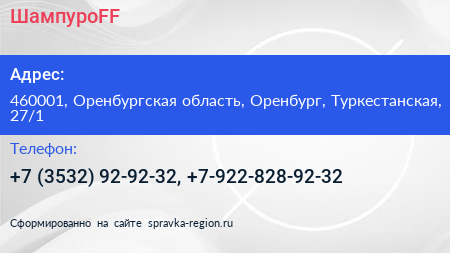 ШампуроFF по адресу 460001, Оренбургская область, Оренбург, Туркестанская, 27/1 в дальнейшем Организация, размещена в следующих категориях: