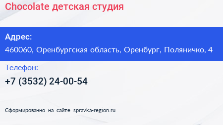 Сhocolate, детская студия по адресу 460060, Оренбургская область, Оренбург, Поляничко, 4 в дальнейшем Организация, размещена в следующих категориях:
