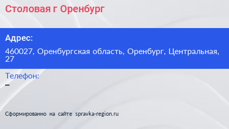 Столовая, г. Оренбург по адресу 460027, Оренбургская область, Оренбург, Центральная, 27 в дальнейшем Организация, размещена в следующих категориях:
