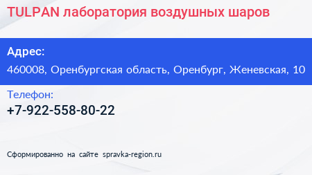 TULPAN, лаборатория воздушных шаров по адресу 460008, Оренбургская область, Оренбург, Женевская, 10 в дальнейшем Организация, размещена в следующих категориях: