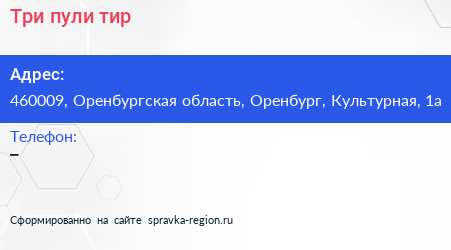 Три пули, тир по адресу 460009, Оренбургская область, Оренбург, Культурная, 1а в дальнейшем Организация, размещена в следующих категориях: