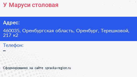 У Маруси, столовая по адресу 460035, Оренбургская область, Оренбург, Терешковой, 217 к2 в дальнейшем Организация, размещена в следующих категориях: