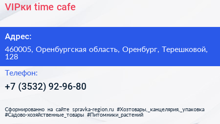 VIPки time & cafe по адресу 460005, Оренбургская область, Оренбург, Терешковой, 128 в дальнейшем Организация, размещена в следующих категориях: