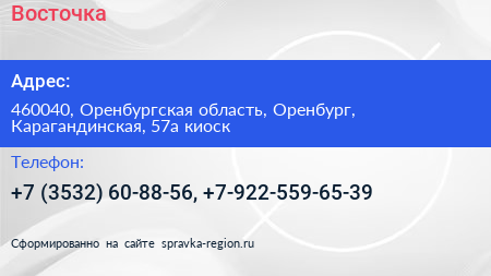 Восточка по адресу 460040, Оренбургская область, Оренбург, Карагандинская, 57а киоск в дальнейшем Организация, размещена в следующих категориях: