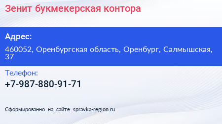 Зенит, букмекерская контора по адресу 460052, Оренбургская область, Оренбург, Салмышская, 37 в дальнейшем Организация, размещена в следующих категориях:
