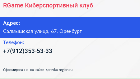 RGame Киберспортивный клуб по адресу Салмышская улица, 67, Оренбург в дальнейшем Организация, размещена в следующих категориях: