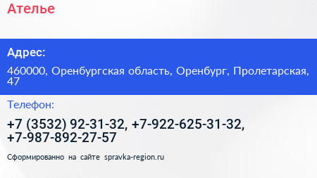 Ателье по адресу 460000, Оренбургская область, Оренбург, Пролетарская, 47 в дальнейшем Организация, размещена в следующих категориях: