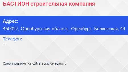 БАСТИОН, строительная компания по адресу 460027, Оренбургская область, Оренбург, Беляевская, 44 в дальнейшем Организация, размещена в следующих категориях: