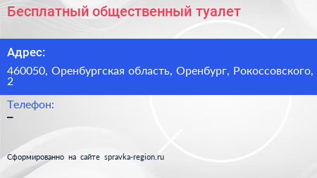 Бесплатный общественный туалет по адресу 460050, Оренбургская область, Оренбург, Рокоссовского, 2 в дальнейшем Организация, размещена в следующих категориях: