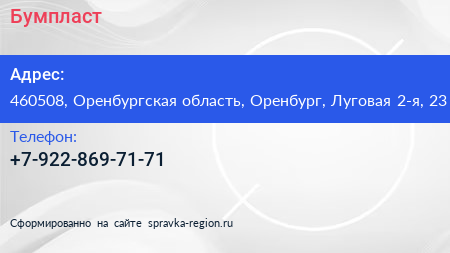 Бумпласт по адресу 460508, Оренбургская область, Оренбург, Луговая 2-я, 23 в дальнейшем Организация, размещена в следующих категориях: