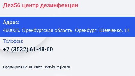 Дез56, центр дезинфекции по адресу 460035, Оренбургская область, Оренбург, Шевченко, 14 в дальнейшем Организация, размещена в следующих категориях: