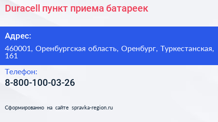 Duracell, пункт приема батареек по адресу 460001, Оренбургская область, Оренбург, Туркестанская, 161 в дальнейшем Организация, размещена в следующих категориях: