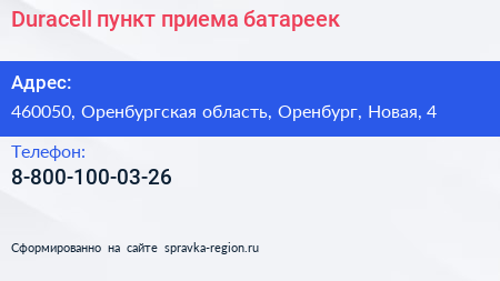 Duracell, пункт приема батареек по адресу 460050, Оренбургская область, Оренбург, Новая, 4 в дальнейшем Организация, размещена в следующих категориях: