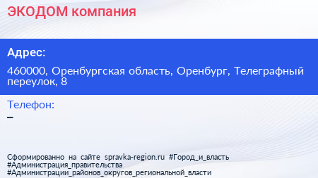 ЭКОДОМ, компания по адресу 460000, Оренбургская область, Оренбург, Телеграфный переулок, 8 в дальнейшем Организация, размещена в следующих категориях: