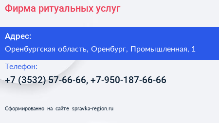 Фирма ритуальных услуг по адресу Оренбургская область, Оренбург, Промышленная, 1 в дальнейшем Организация, размещена в следующих категориях: