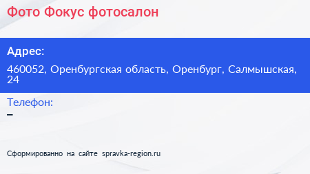 Фото Фокус, фотосалон по адресу 460052, Оренбургская область, Оренбург, Салмышская, 24 в дальнейшем Организация, размещена в следующих категориях: