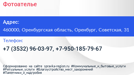 Фотоателье по адресу 460000, Оренбургская область, Оренбург, Советская, 31 в дальнейшем Организация, размещена в следующих категориях: