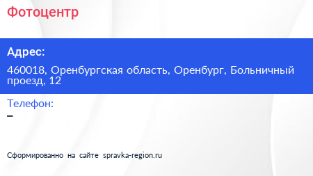 Фотоцентр по адресу 460018, Оренбургская область, Оренбург, Больничный проезд, 12 в дальнейшем Организация, размещена в следующих категориях: