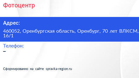 Фотоцентр по адресу 460052, Оренбургская область, Оренбург, 70 лет ВЛКСМ, 16/1 в дальнейшем Организация, размещена в следующих категориях: