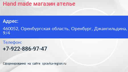 Hand made, магазин-ателье по адресу 460052, Оренбургская область, Оренбург, Джангильдина, 9/4 в дальнейшем Организация, размещена в следующих категориях: