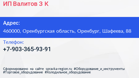 ИП Валитов З.К. по адресу 460000, Оренбургская область, Оренбург, Шафеева, 88 в дальнейшем Организация, размещена в следующих категориях: