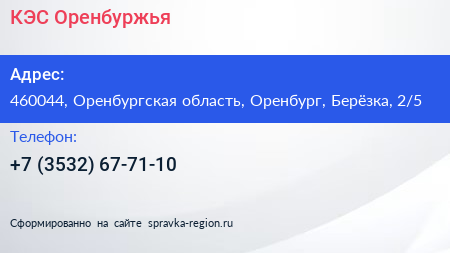 КЭС Оренбуржья по адресу 460044, Оренбургская область, Оренбург, Берёзка, 2/5 в дальнейшем Организация, размещена в следующих категориях: