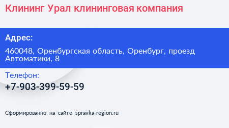 Клининг-Урал, клининговая компания по адресу 460048, Оренбургская область, Оренбург, проезд Автоматики, 8 в дальнейшем Организация, размещена в следующих категориях: