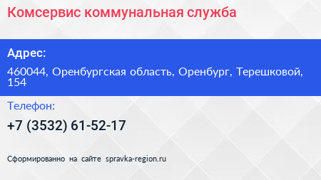 Комсервис, коммунальная служба по адресу 460044, Оренбургская область, Оренбург, Терешковой, 154 в дальнейшем Организация, размещена в следующих категориях: