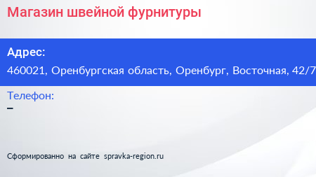 Магазин швейной фурнитуры по адресу 460021, Оренбургская область, Оренбург, Восточная, 42/7 в дальнейшем Организация, размещена в следующих категориях:
