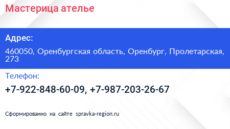 Мастерица, ателье по адресу 460050, Оренбургская область, Оренбург, Пролетарская, 273 в дальнейшем Организация, размещена в следующих категориях: