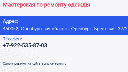 Мастерская по ремонту одежды по адресу 460052, Оренбургская область, Оренбург, Брестская, 32/2 в дальнейшем Организация, размещена в следующих категориях: