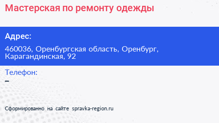 Мастерская по ремонту одежды по адресу 460036, Оренбургская область, Оренбург, Карагандинская, 92 в дальнейшем Организация, размещена в следующих категориях: