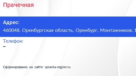 Прачечная по адресу 460048, Оренбургская область, Оренбург, Монтажников, 1 в дальнейшем Организация, размещена в следующих категориях: